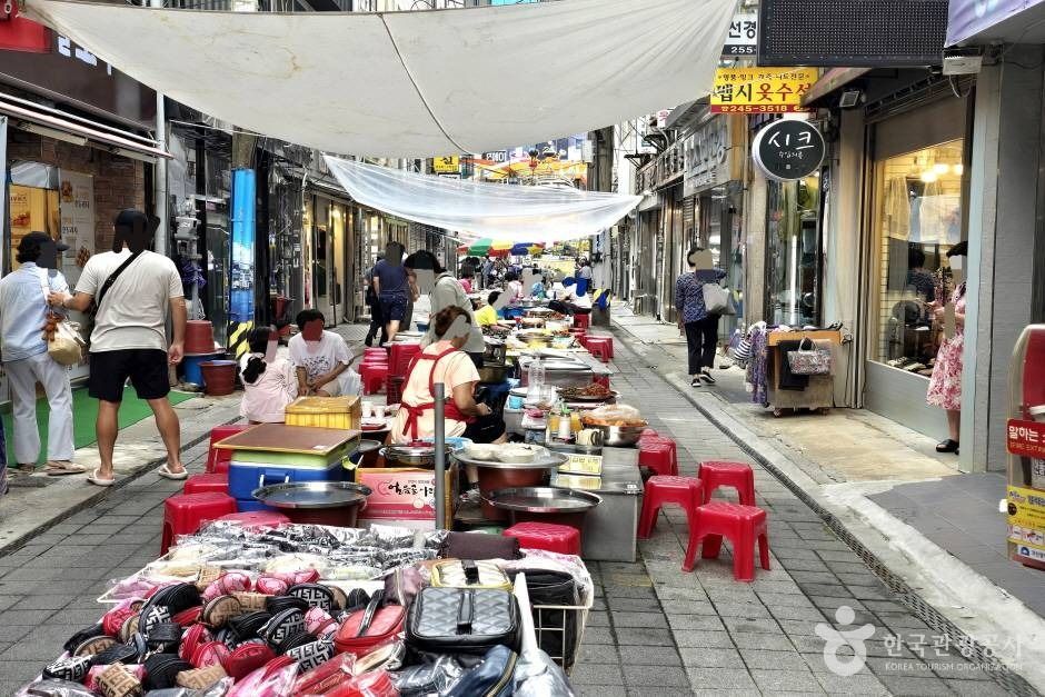 창선동 국제시장 내 먹자골목은 야외 음식점으로 60년이 넘는 역사를 자랑하며, 새콤한 오징어무침을 곁들인 충무김밥과 달콤하면서도 매콤한 맛이 매력인 떡볶이, 물국수와 순대, 부산의 명물인 비빔당면과 팥빙수 등 다양한 길거리 음식을 맛볼 수 있는 곳이다. 국제시장 골목길 좌판 의자에 앉아서 먹고 즐기는 풍경은 우리나라 재래시장의 정감 넘치는 모습 중 하나로, 내국인은 물론 외국 관광객들이 필수적으로 찾는 먹거리 골목이다. 국제시장 먹자골목을 경험하고 국제시장의 옷, 구두, 액세서리 등 다양한 쇼핑을 즐겨보자.